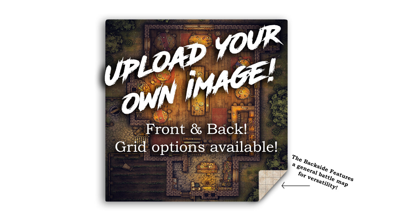 Build you own TTRPG Battle Map to make it the perfect addition to any TTRPG or Wargaming game. This double-sided map offers square, hexagon, and grid less options, making it versatile for any game. Use the back for general use or flip it for a themed setting. With its 2ft x 2ft size, it's compatible with popular games like Dungeons & Dragons, Daggerheart and Pathfinder. Enhance your game experience with the TTRPG Battle Map! Bring your story to life with Jank Mats custom Playmat Builder